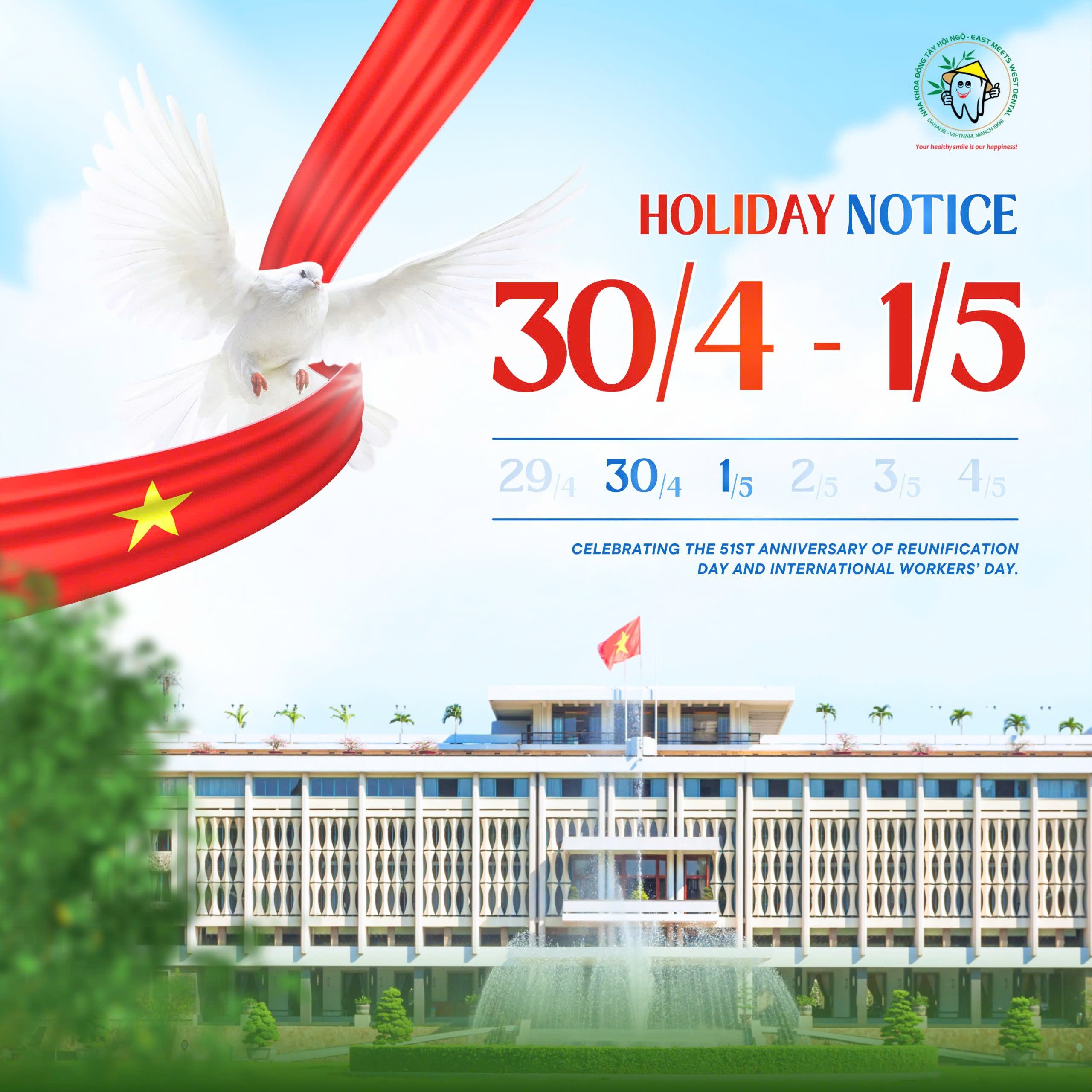 Celebrating the 51st Anniversary of Reunification Day and International Workers’ Day, EMW Dental would like to wish you and your loved ones a joyful, healthy, and wonderful holiday!